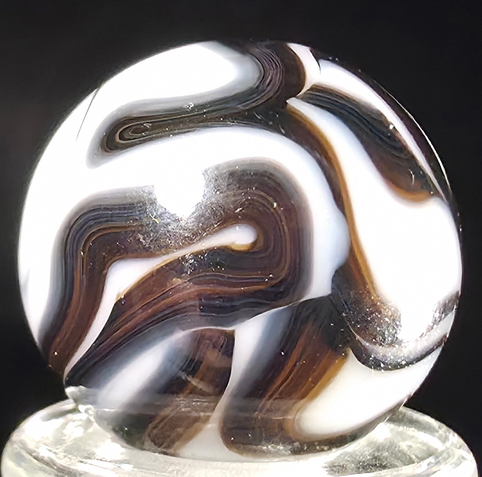 Nice shooter size with oxblood inside the transparent brown swirl